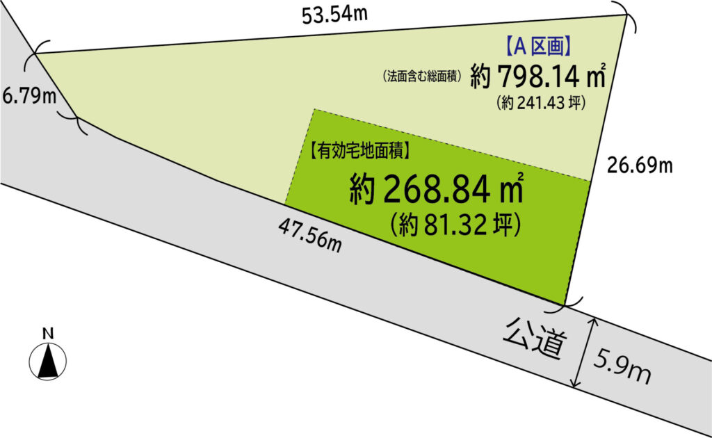 土地面積(実測) 約798.14㎡(約241.43坪) ※有効宅地面積:約268.84㎡(約81.32坪)